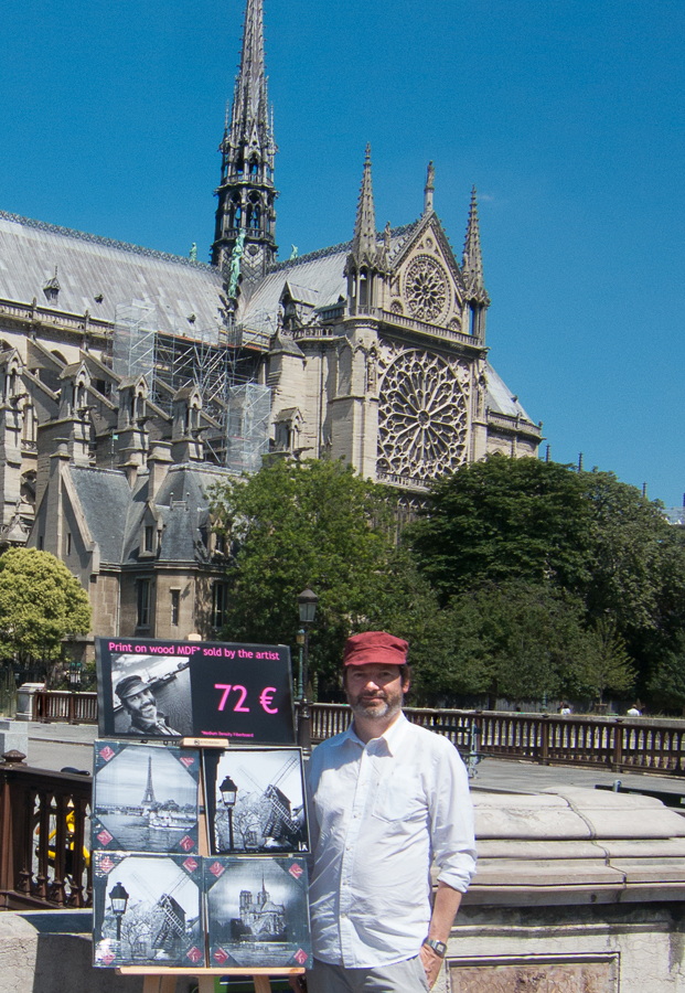 Dans le coin de Notre Dame, on peut croiser le photographe Christian de Brosses, un artiste qui vend ses photos dans la rue. Malheureusement pas devant car le parvis de la cathédrale est soumis à des règles particulièrement strictes. Des petits groupes en civil ou en uniforme sont chargés d’expliquer et de faire respecter les règles applicables dans ce périmètre.